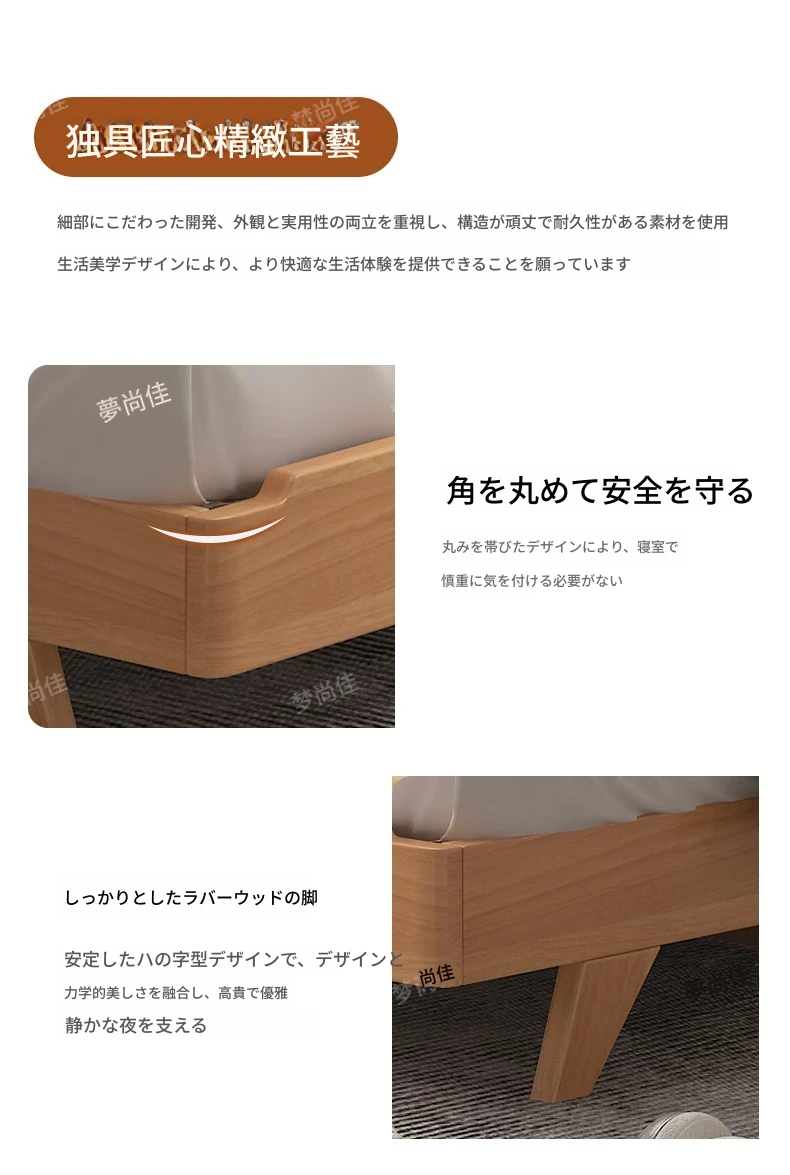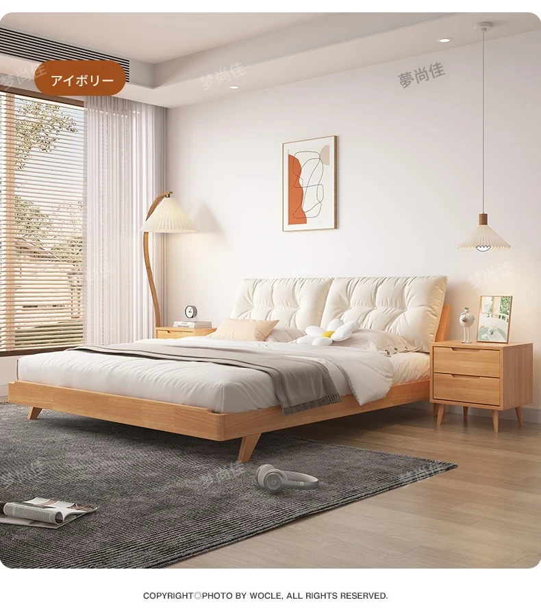 和風天然木製クラウド型ベッド - シンプルで洗練された侘び寂びスタイル!オーク無垢材使用のダブルベッド、1.8m&1.5m対応、主寝室にぴったり!