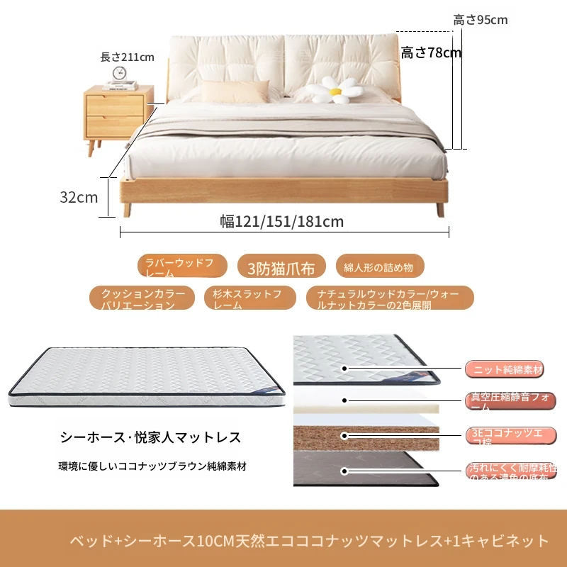 ベッド+シーホース15CM天然エコココナツファイバーマットレス+1キャビネット マットレス:コットン素材