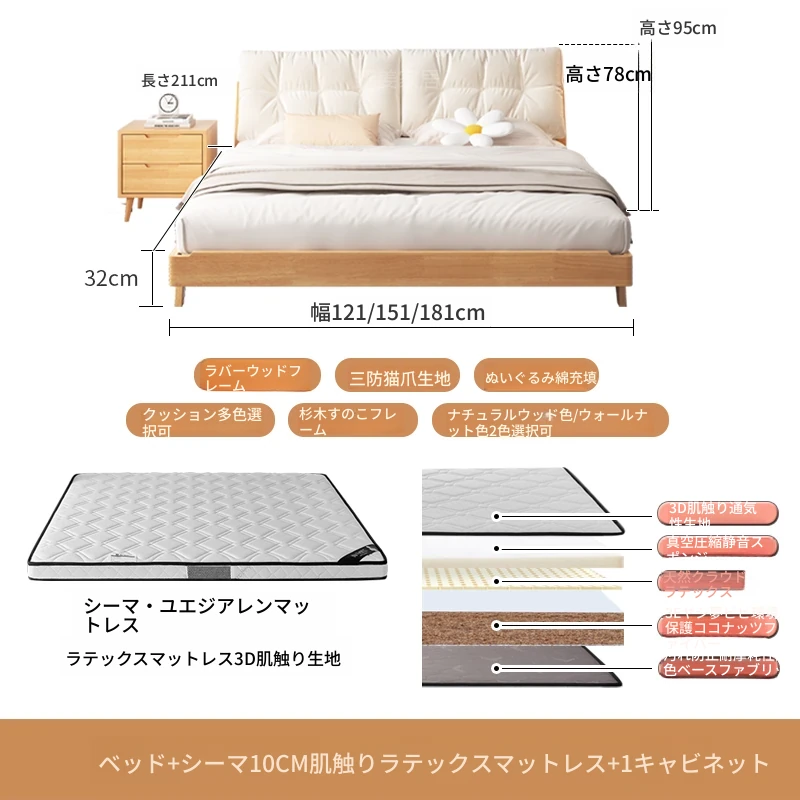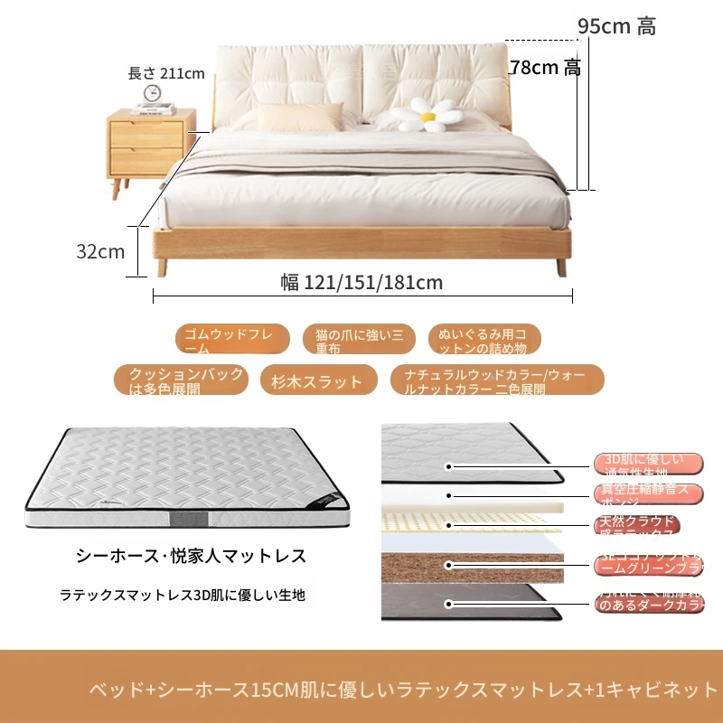 ベッド+シーホース15CM肌に優しいラテックスマットレス+2キャビネット マットレス:程よい硬さ