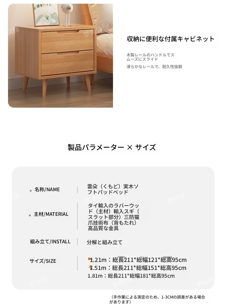 ナチュラルウッドカラーのベッド+ナイトテーブル*1