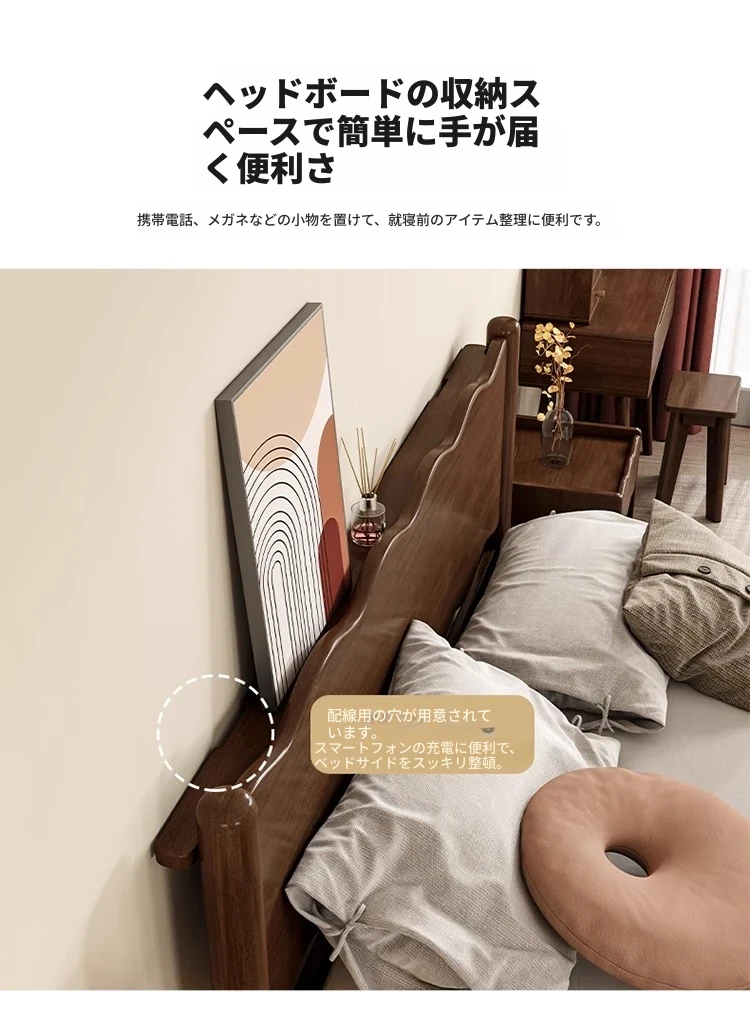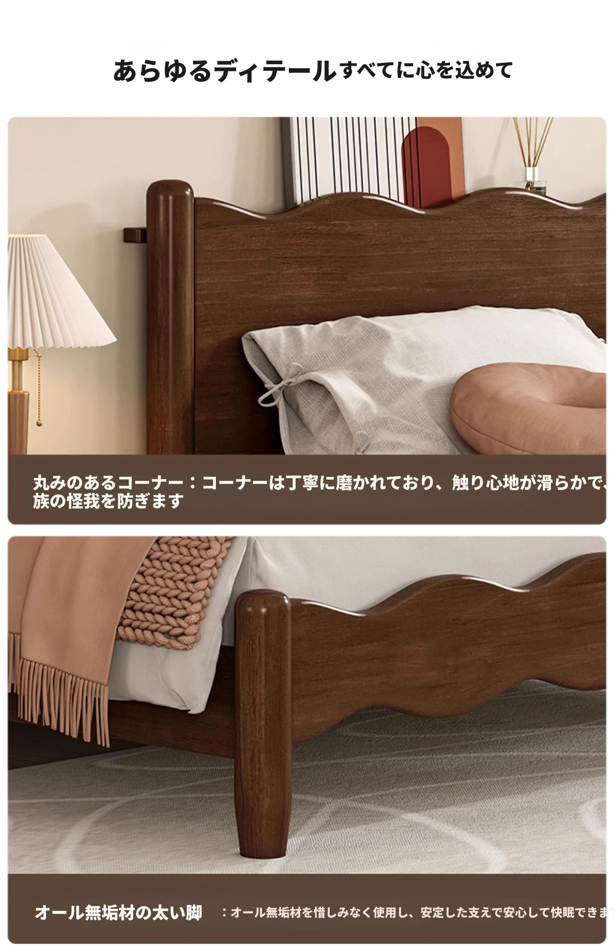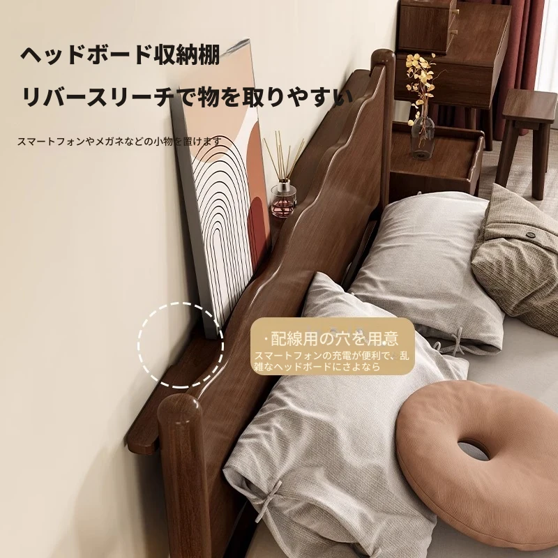 モダン北欧ヴィンテージ無垢材ベッド、1.5m/1.8mウェーブ型デザイン、ウォールナット色のシンプル&エレガントなソフトパッドダブルベッド - 快適な寝室空間を演出する理想の婚約ベッド!