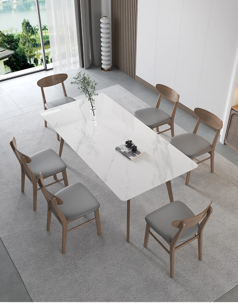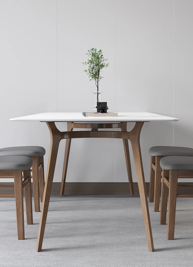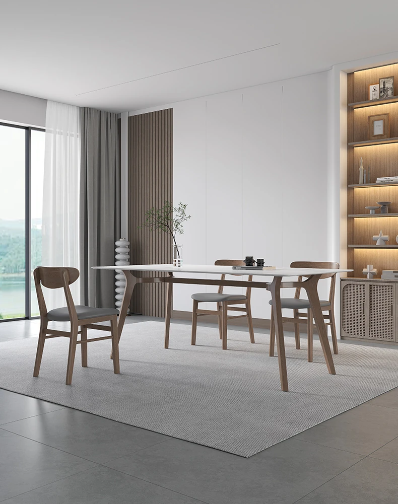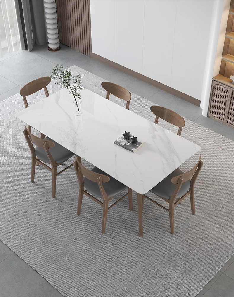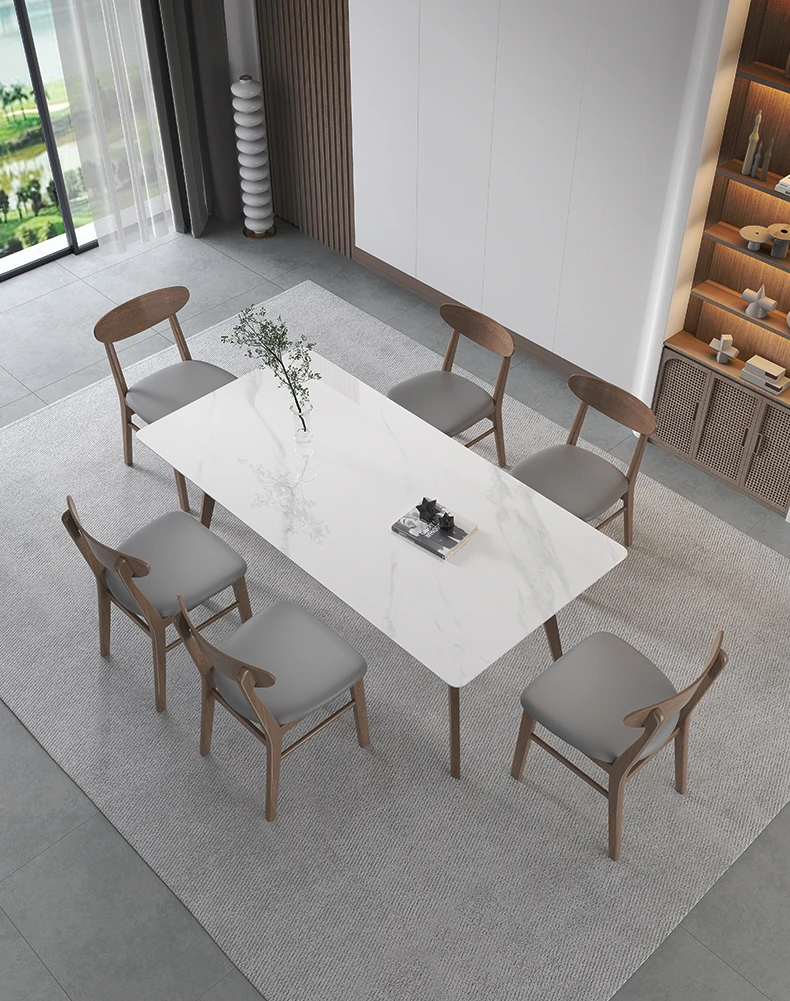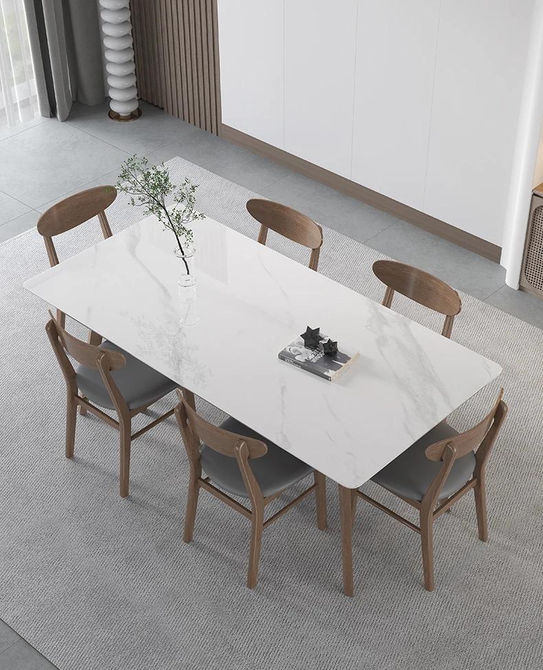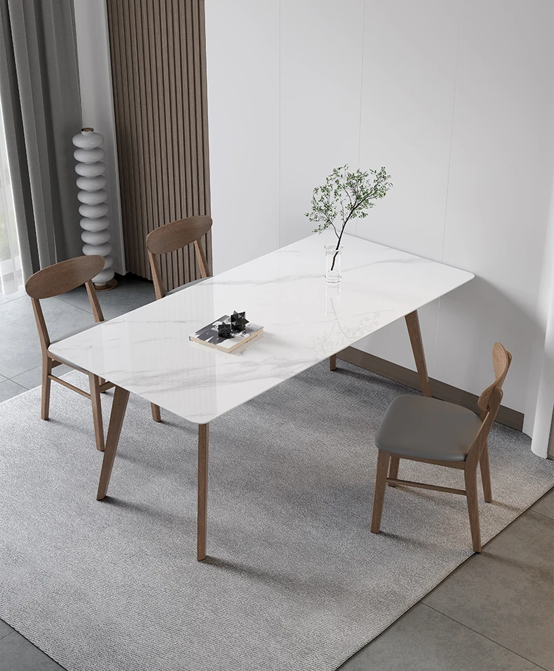 光沢のある天然木製ダイニングテーブル - モダンでシンプルな高級ウォールナット色、狭い部屋にもぴったりな長方形デザイン。食事のひとときを特別なものに!