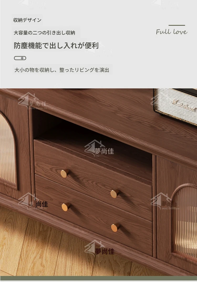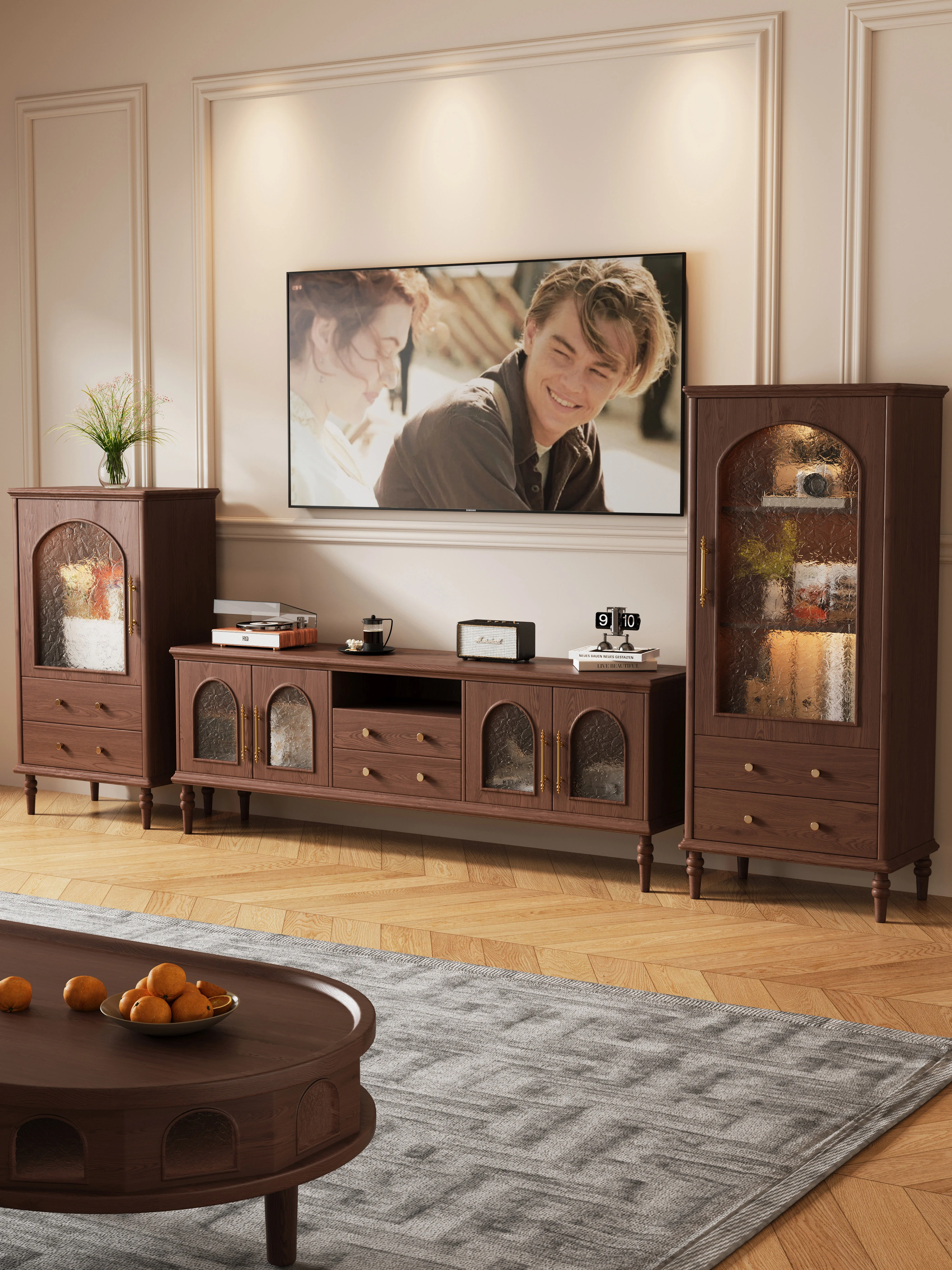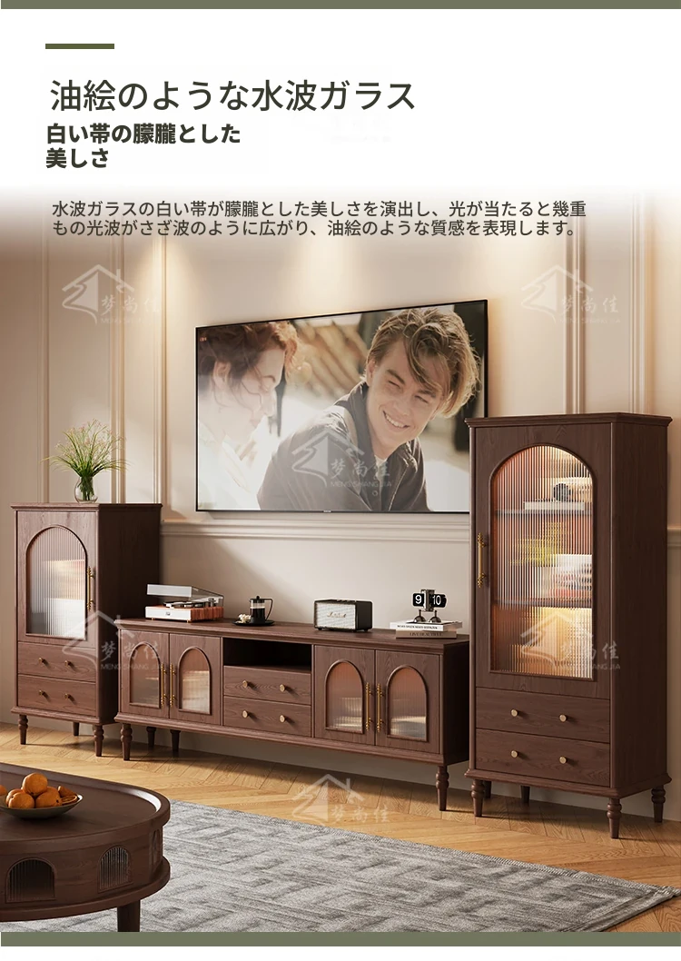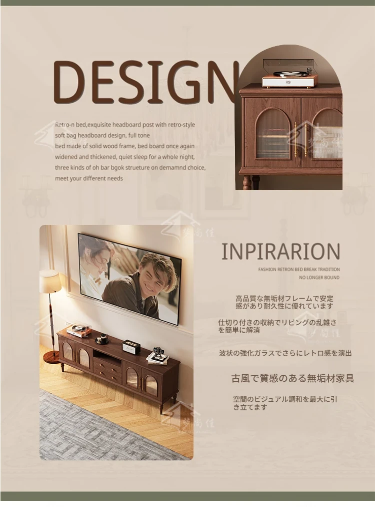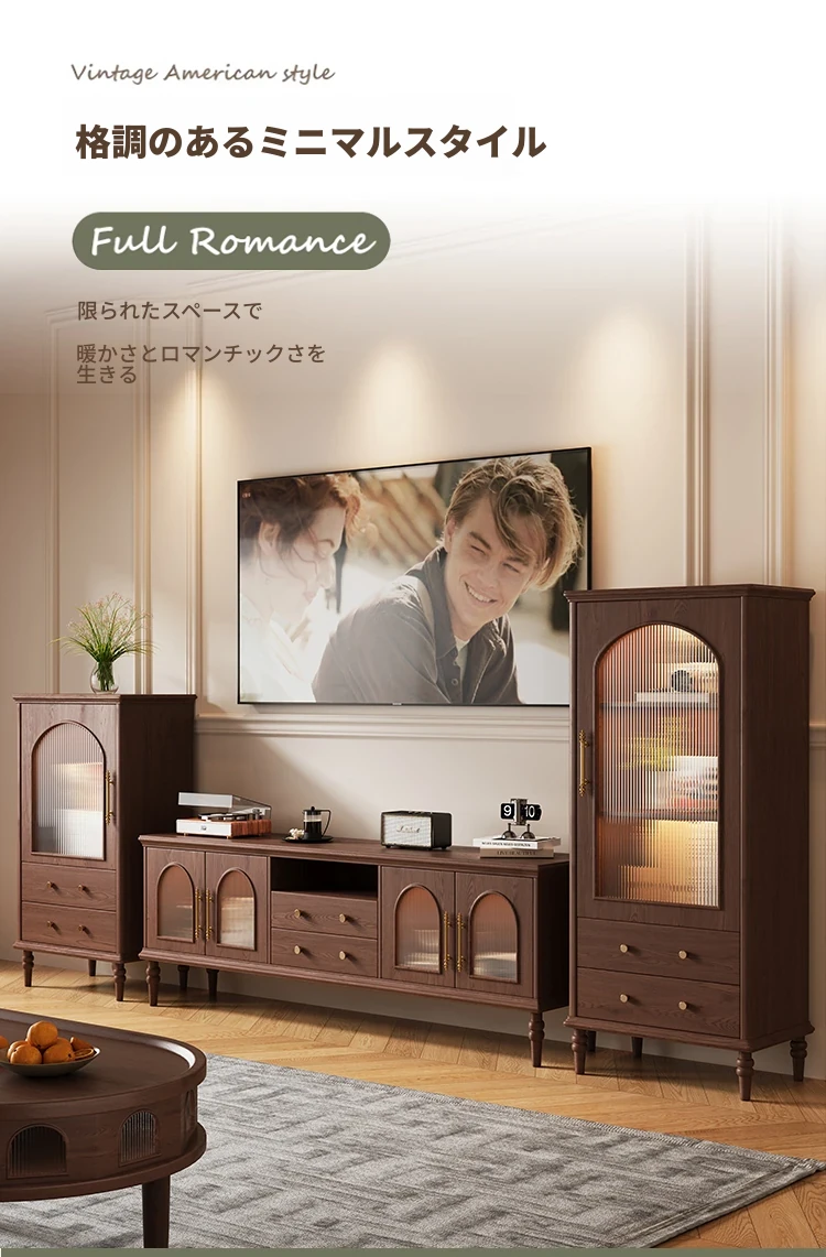 アメリカンカントリー風ヴィンテージウォールナット色天然木製テレビ台&コーヒーテーブルセット - 大容量収納付き!リビングをスタイリッシュに彩る実用家具