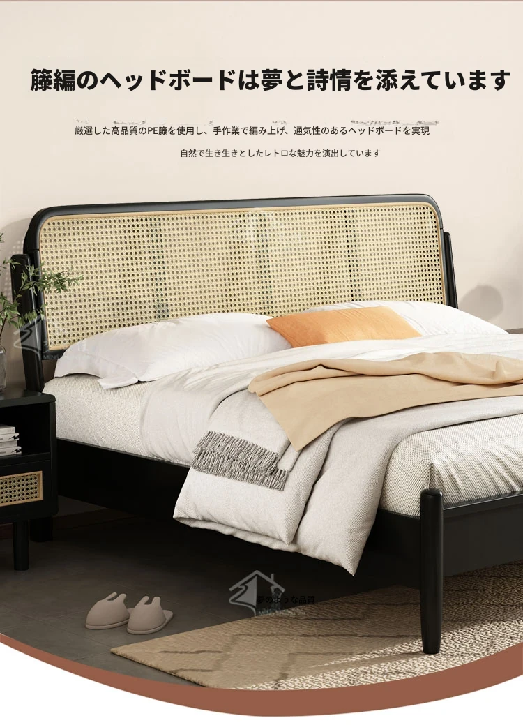 北欧デザインのラタン編みのブラックウッドベッド|フレンチスタイルのダブルベッド|民宿や和モダンにぴったりな侘寂風ヴィンテージオーク家具|静かな時間を提供する中古スタイルの寝室用家具