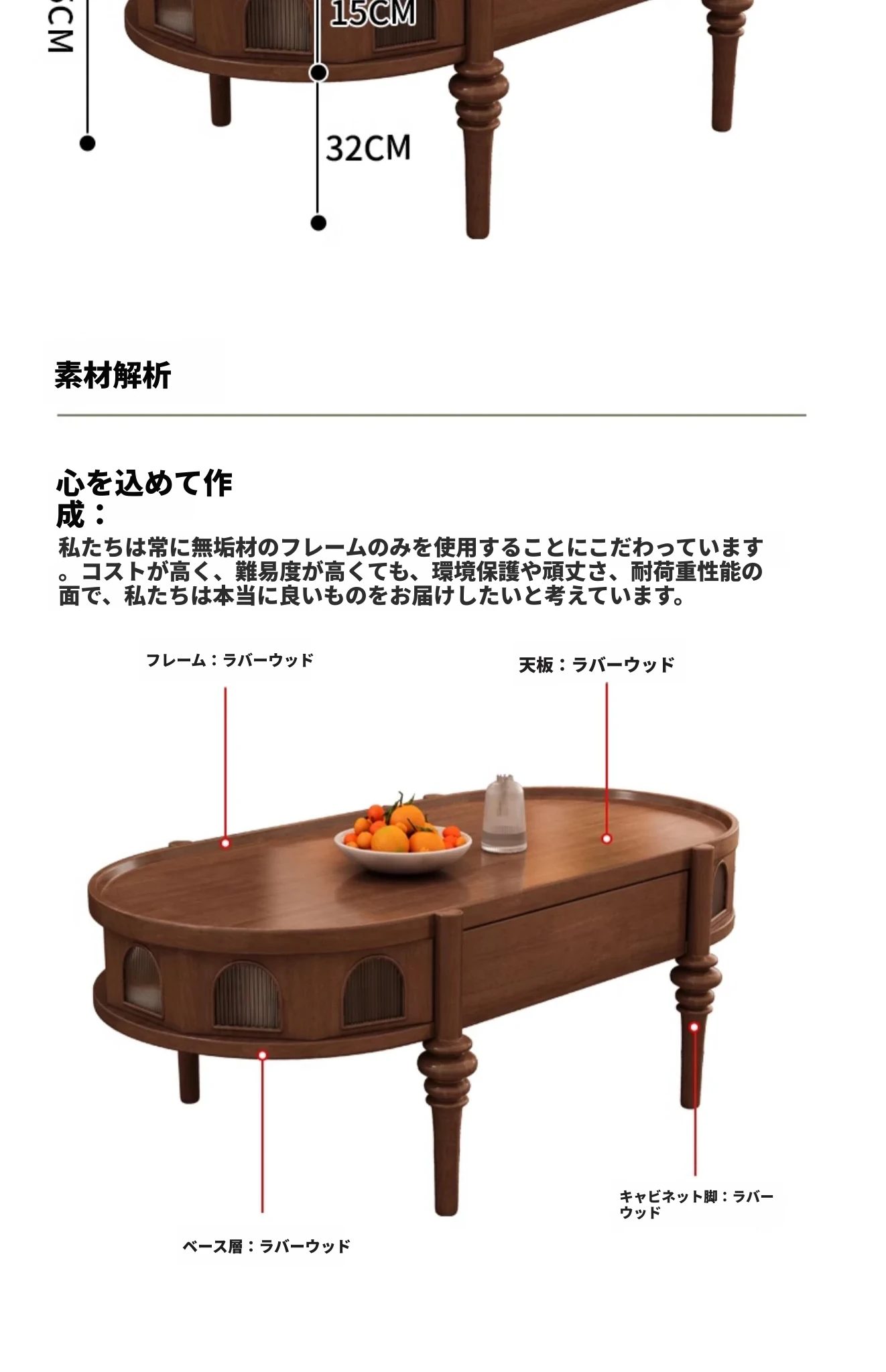 ウォールナット色の無垢材コーヒーテーブル 10年保証